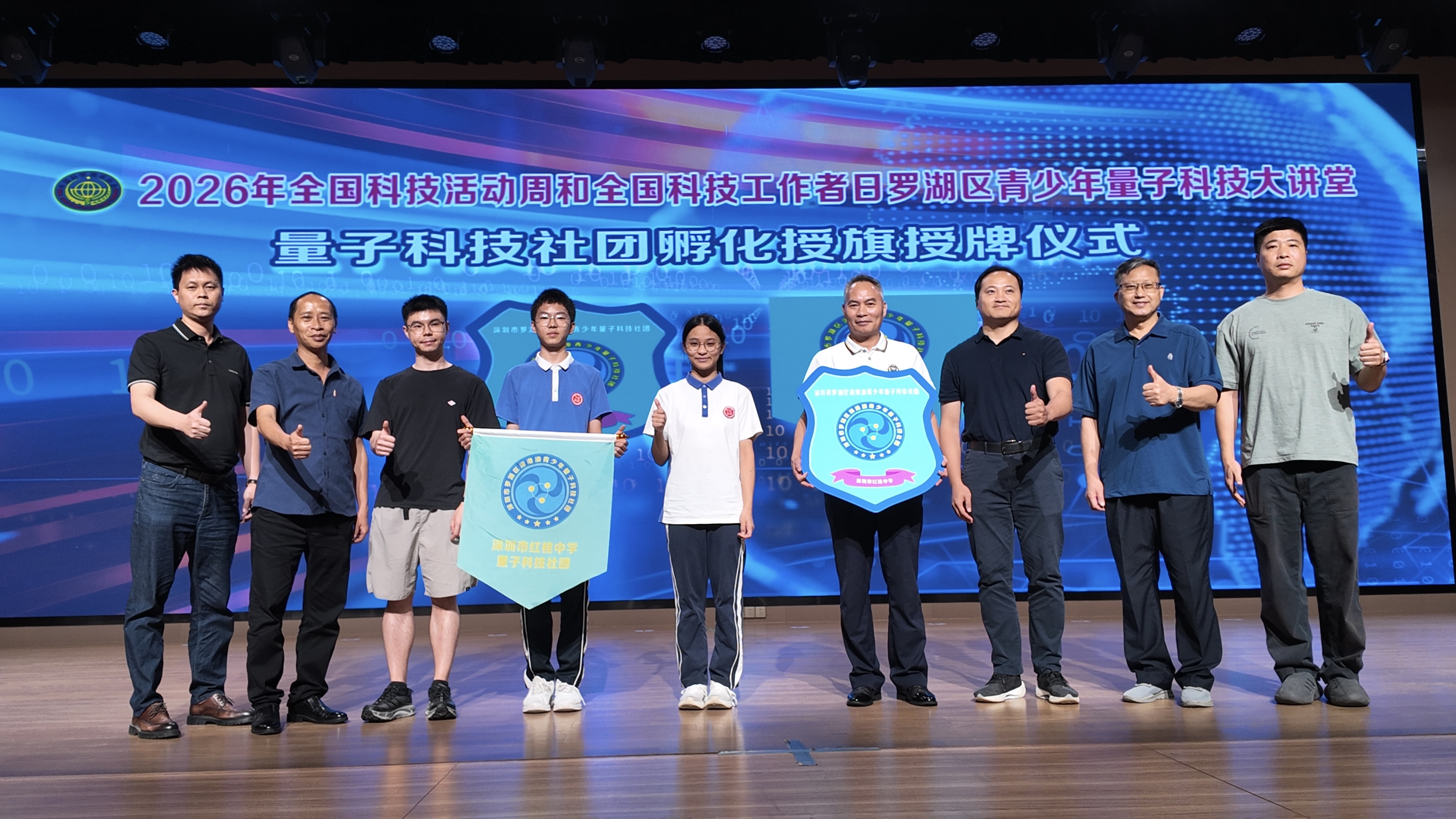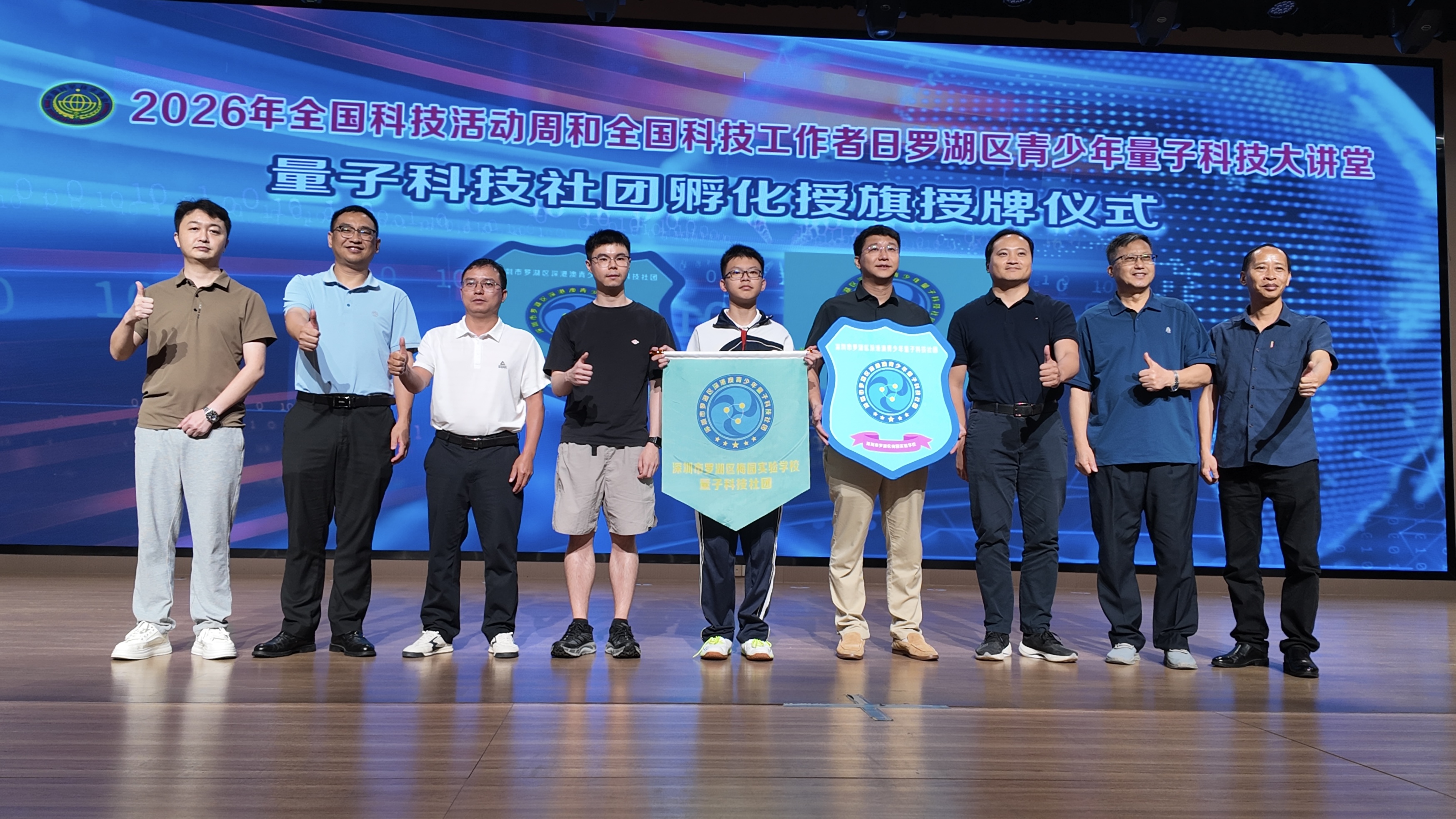后续活动进入量子科技社团孵化授牌仪式,在全体参会人员的见证下,黄泽全副局长与巫梓鹏博士共同为梅园实验学校和红桂中学的量子科技社团授牌授旗。两校校领导携学生代表上台接牌,鲜红的旗帜与闪亮的牌匾象征着量子科普教育在罗湖初中校园正式扎根。活动现场,全体领导嘉宾、企业代表、校领导、中层干部及学生代表共同合影留念,标志着两所学校量子科技社团正式成立、全面启动。